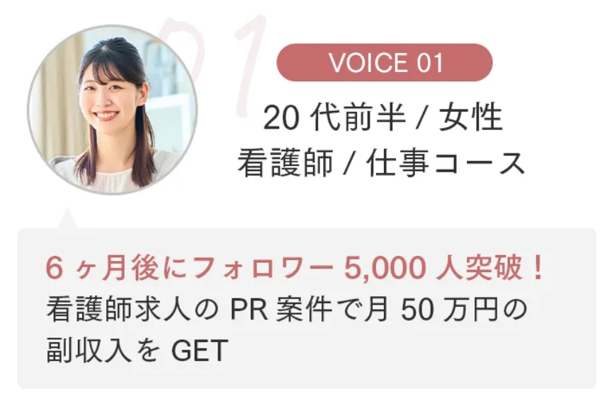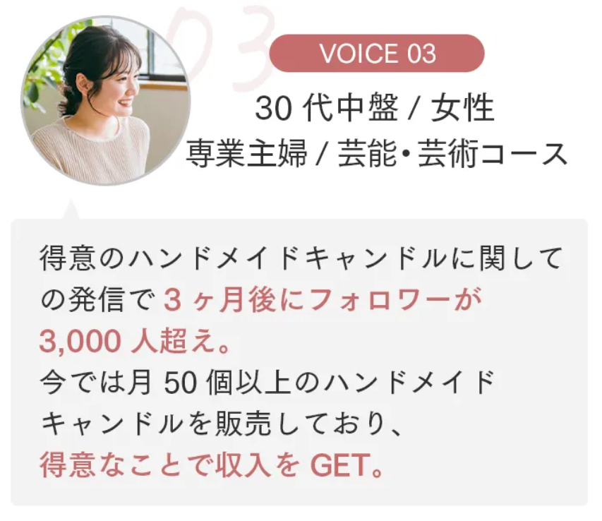 SNSは普段から使っていたものの、フォロワーを増やしたり収益化につなげたりする方法はまったく分かりませんでした。SONOMAMAのカリキュラムは段階的に整理されていて、基礎から応用まで自然に理解できる流れになっているので、初心者の自分でも迷わず実践できました。